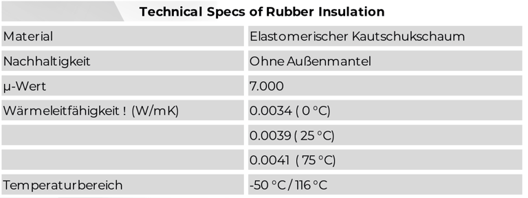 Durch die hochwertige Elastomer-Isolierung mit einer niedrigen Wärmeleitfähigkeit von λ = 0,034 W/mK werden Energieverluste effektiv reduziert und eine hohe thermische Effizienz gewährleistet.
