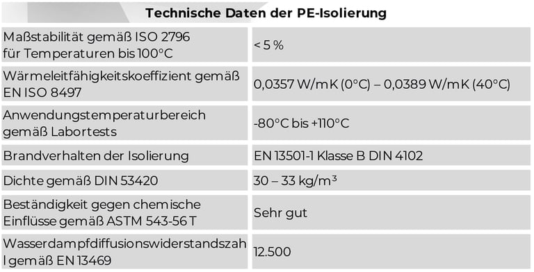 The copper pipe is made of Cu-DHP 99.9% in accordance with EN 12735-1 and is insulated with an expanded closed-cell PE foam. An additional outer LDPE protective layer provides enhanced protection against mechanical impact and environmental influences.